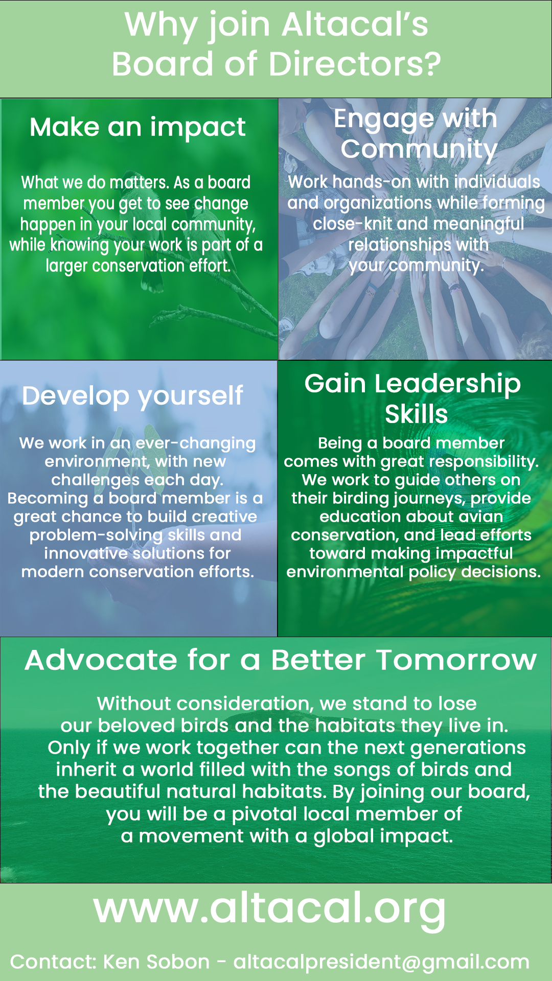 AltaCal Bird Alliance is a chapter of the National Audubon Society. AltaCal is a separately incorporated non-profit organization with a local chapter membership.